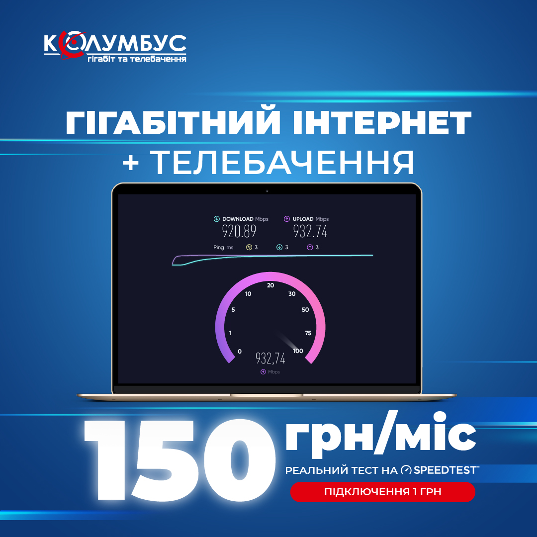 ГІГАБІТ від Колумбус – Це нова сучасна оптоволоконна мережа за технологією PON та FTTx (FTTH/FTTB). Швидкість передачі даних по такому каналу досягає 1 Гбіт/с (≈1000 Мбіт/с). Технологія може гарантувати надійний сигнал і високу швидкість доступу в будь-який час доби.